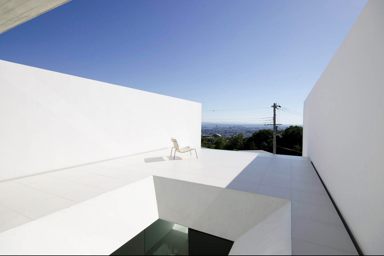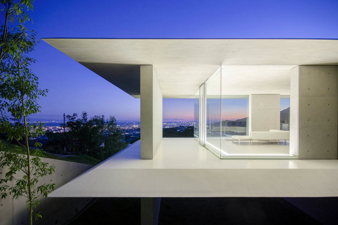 It’s positioned close to the peak of a mountain on a sloped site that has been cut out of the mountain’s side.