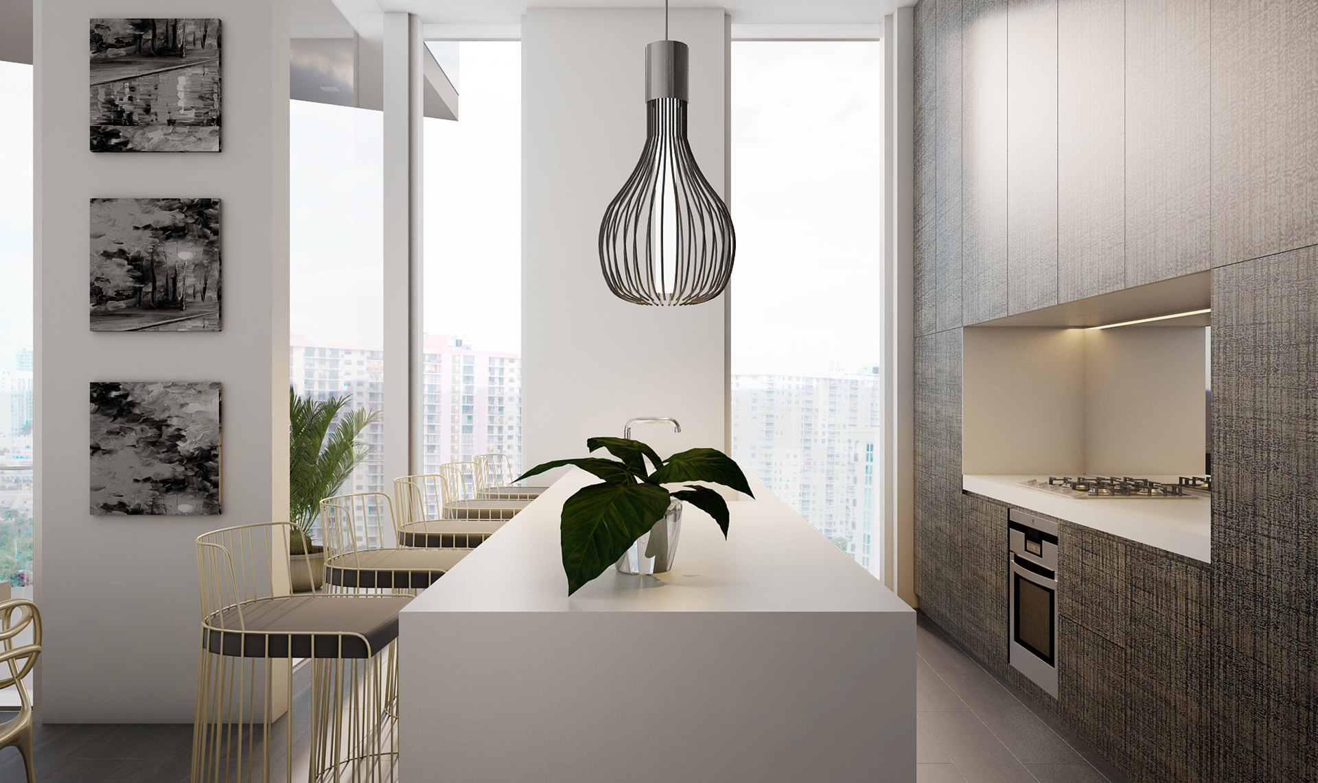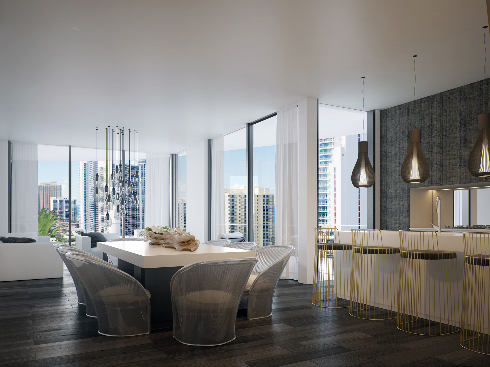 Residence #1205 offers a 372 sq.ft. private terrace, 10′ ceilings, private elevator, smart home technology system, and upscale appliances by Wolf and Sub-zero. Aurora is a boutique, luxury building located in the heart of Sunny Isles Beach, just across from the ocean with beach services provided through our pool attendants. It also includes an array of resort-quality outdoor amenities, outdoor theatre and relaxation area fashioned for families and hosting outdoor events. Alongside the water features, residents can enjoy lush landscaping throughout.