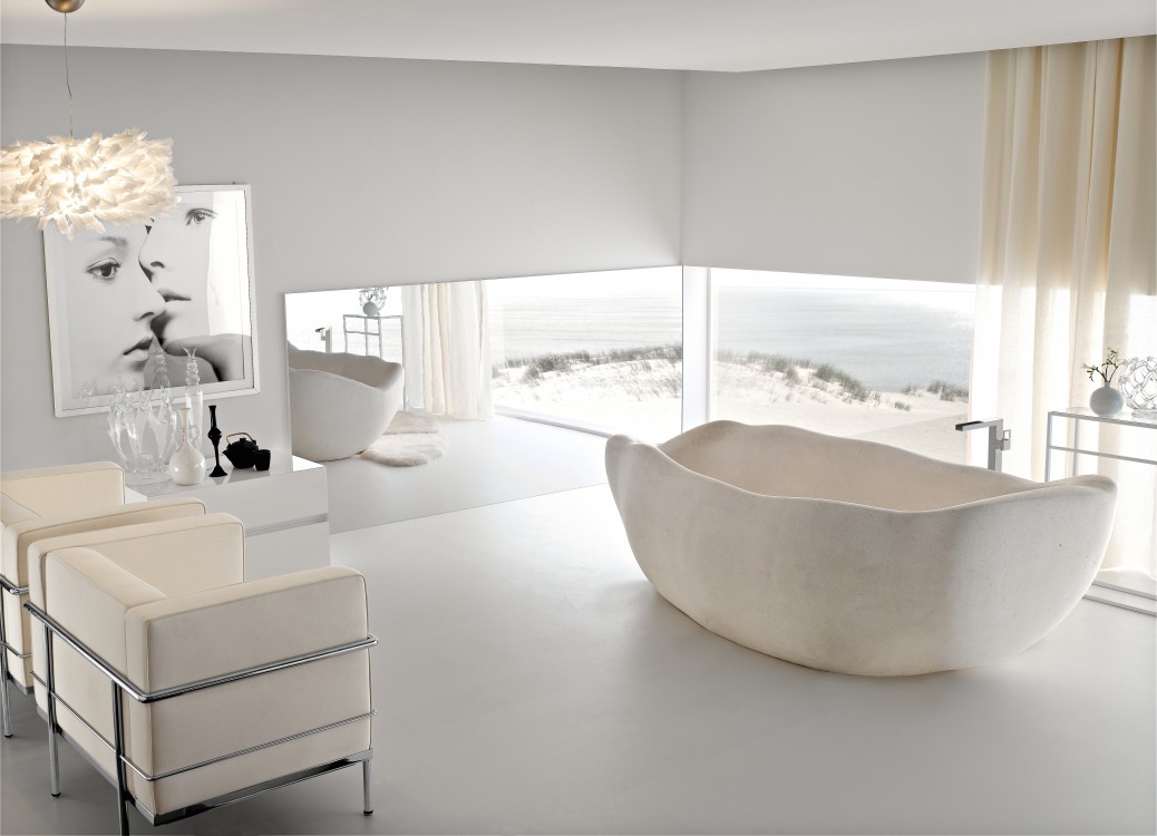 Emblematic of the luxury bathroom is the freestanding tub and stunning view. The central focal point and sculptural element in this luxury bathroom is the tub itself with its organic, shell-like form that softens the room’s rectangular shape and brings indoors the serenity of the beach.