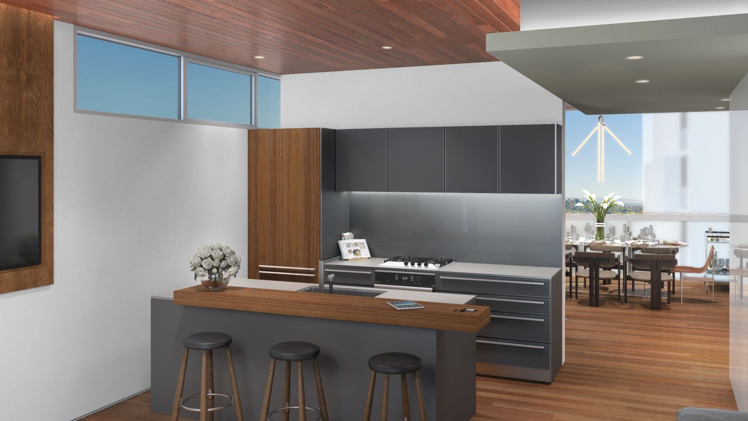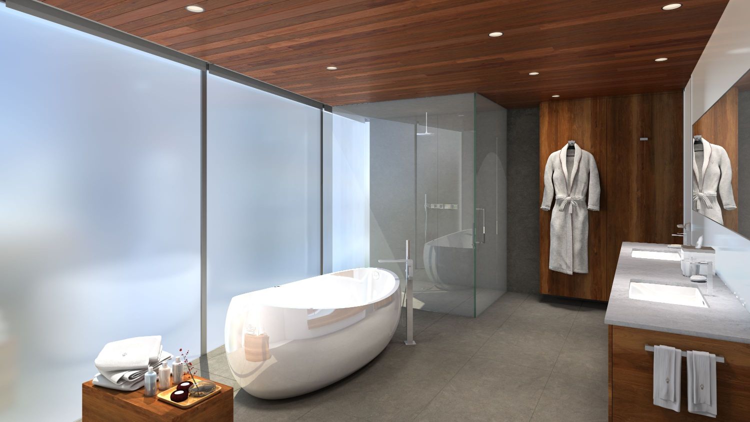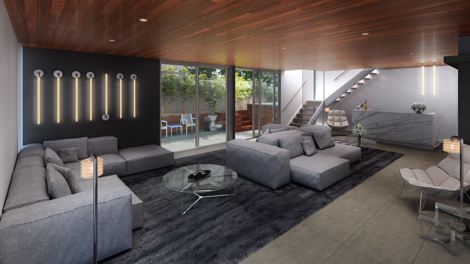 Dark-hued, open interiors are lined with glass windows and redwood and custom teak walls. Each unit is furnished by interior designer Marcello Pozzi, who also furnished the interiors of Mr. C Beverly Hills.