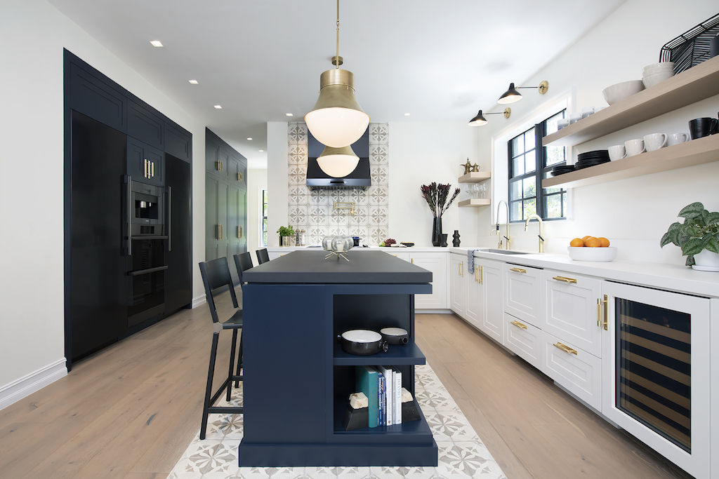 The custom pattern of the cabinet door style is reminiscent of the stepped outlines in art deco architecture. The sink wall is free of wall cabinets for simplicity. The interest and detail of the cabinet doors are balanced by their colors, which steer the design into a timeless and neutral take on deco decadence. A deep shade of navy is used for the tall cabinetry and the island, adding elegance and a subtle reminder that this home is steps away from the ocean. The appliances are from Dacor’s Modernist Collection. This new collection of graphite stainless steel appliances lends itself to be seamlessly integrated into the design, both physically and visually. The commanding visual presence of the dark cabinetry and appliances is contrasted by off-white cabinetry along the perimeter. These brighten the edge of the room, enhancing the feeling of spaciousness. Above, open wood shelves in a custom finish, to match the floor, heighten the sense of lightness and openness while adding Old World charm. Undoubtedly, the focal point is the hand-painted tile that borders the island, almost like a carpet, continuing on the floor up to the cooktop and over on the hood wall. This design statement is kept to one section. All else recedes in elegant restraint to allow this gesture to become the dramatic, focal point of the kitchen.