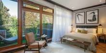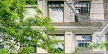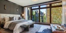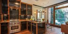 The light-filled main level houses an open kitchen, which features Wolf Range, Sub-Zero fridge, Miele dishwasher, and wine fridge; custom walnut cabinetry and large island; and an adjacent dining area that opens out to a private garden-facing balcony. The large and inviting living room on this floor boasts three spectacular floor-to-ceiling windows and impressive 10-foot ceilings. Also on this floor is a powder room and washer dryer. One level up you’ll find a generous bedroom with a wall of closets and its own balcony, a library (or guest bedroom) with a working gas fireplace, and a four-piece bath done in full-slab Carrera marble with Water Works fixtures.
