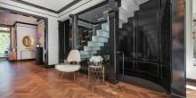 Other outstanding apartment details include rich walnut herringbone floors throughout, subfloor heating throughout, central air, a central floating staircase with Carrera marble steps and walls lined in dramatic ebony-painted raised wood panels, and custom-made soundproof Bieber mahogany windows imported from the South of France.