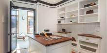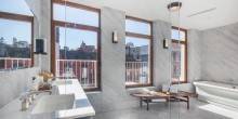 The top level of the triplex is truly a master oasis fit for the discerning city dweller. Sunlit and sublime, the sleeping side of the floor features a wall of floor-to-ceiling windows that open onto a private terrace. The opposite side of the level is a spa-lover’s dream: an enormous five-piece bathroom also done in full-slab marble with Water Works fixtures, complete with soaking tub, glass-walled shower, and double sinks. Connecting the two wings of the third floor is a custom walk-in closet with a large island cabinet and room enough to dress in style.