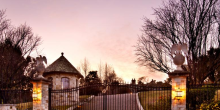 The home’s Grand Terrace looks out across the 6-acre grounds onto San Francisco Bay. The manicured lawns are completed by both a formal statuary garden and a rose garden, as well as a pool with guest house.