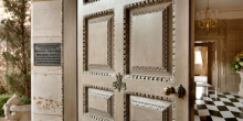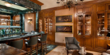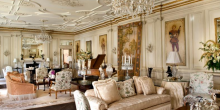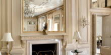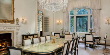 Wrought-iron gates open onto manicured grounds, with a cobblestone drive leading up to the motor court (complete with stone fountain) at the home’s entrance. The foyer in black and white marble leads to the formal dining room (with carved marble fireplace), loggia, grand terrace, library (with 17th Century English paneling, music room (with antique parquet-de-Versailles floorings, triple gold-gilt moldings and matching fireplaces), media room, personal gym, wine vault, bar room, and kitchens (there are four). The 12-bed, 15-bath home features four master quarters and a VIP suite, as well as a separate guest apartment.