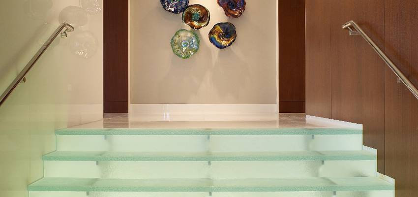 Slip Resistant: Glass steps are slip resistant. An imbedded texture provides an anti-skid surface that is scratch- proof and easily hides any smudges or streaks. ThinkGlass stair treads exceed current standards for “coefficient of friction” requirements as specified by ASTM section c1028, Underwriters Laboratories UL-410, and ADA.