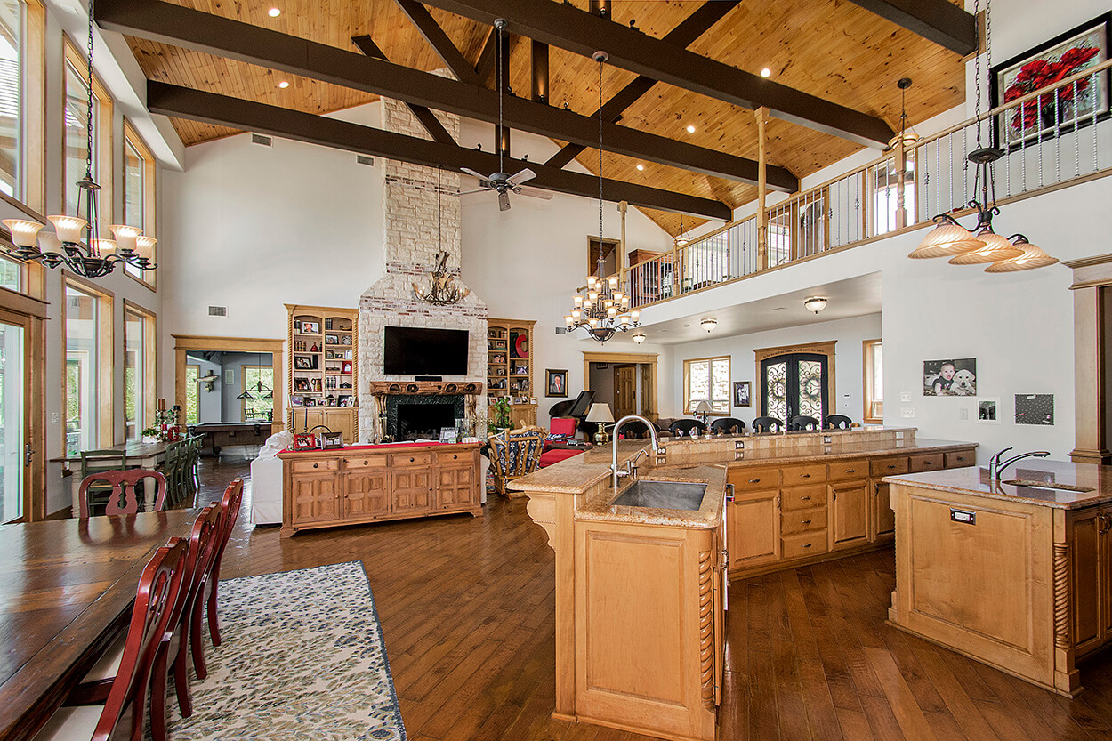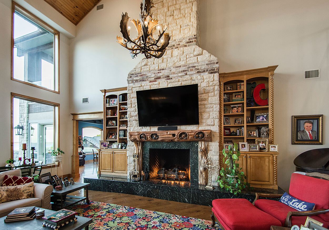 Built to endure, Legacy Lakefront Estate is located on a deep water cove on the southeastern shores of Lake Texoma. This 11,500 square-foot, six-bedroom home has lake views from almost every room, professional-grade indoor and outdoor kitchens, and a two-story pool designed to maximize entertaining and sunset views on the lake. Entertain family and friends from the open great room, kitchen, and dining room. All under a 33’ beadboard ceiling, with 5 full-span, 50’ cross beams and floor-to-ceiling Pella windows overlooking the award-nominated pools, patio, and the lake for easy transition between indoors and out. The centerpiece of the great room is a 30-foot tall stone and brick fireplace, with an 18-foot wide forest green marble hearth, and an eight-foot-wide hand carved fireplace mantle by a Jackson Hole artist.