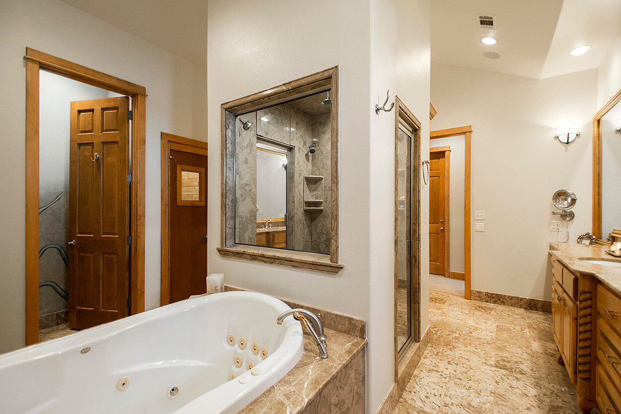 View the wooded cove from the library, which features built-ins and a 100-year-old oak and brass rolling ladder. Wake up to a lake view from the master suite. The master bedroom has a trey ceiling, 64” television, and a full-length, north-facing covered patio for an amazing view from the bed. The master bath has his/her sides, complete with separate water closets with hand-painted murals. A pass-through shower is accessible from either side. With a deep Jacuzzi tub, double granite vanities and sinks, a bidet, marble floors, and a dry sauna, you don’t have to give up luxury just because you’re at the lake. The master wing is accessible by stairs or an elevator. Between the master bedroom and study is an upstairs wet bar with granite counters, sink, microwave, and a Viking refrigerator.