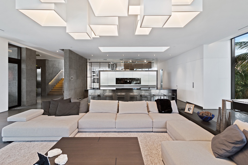 The second level has two full kitchens, a huge family room, living room, media room, and a full bar area. All of these main rooms have unobstructed ocean views. A “Living Wall” and linear spark gas fireplace with floating marble canopy add a peaceful and organic feeling to these entertaining areas. A large formal dining room suitable for up to 16 has a temperature-controlled glass showcase wine cellar with 1,184 bottle capacity that serves to separate the dining and family room. The 10 seat media room luxuriously furnished by Cinematic with Sony laser projector and JBL Synthesis Dolby Atmos sound system is located on this floor as well. A sun-splashed, infinity-edge pool and spa and a large covered terrace with an exterior kitchen located just off of the family room offer a beautiful vantage to cool off from a warm day and gaze at the sand and ocean