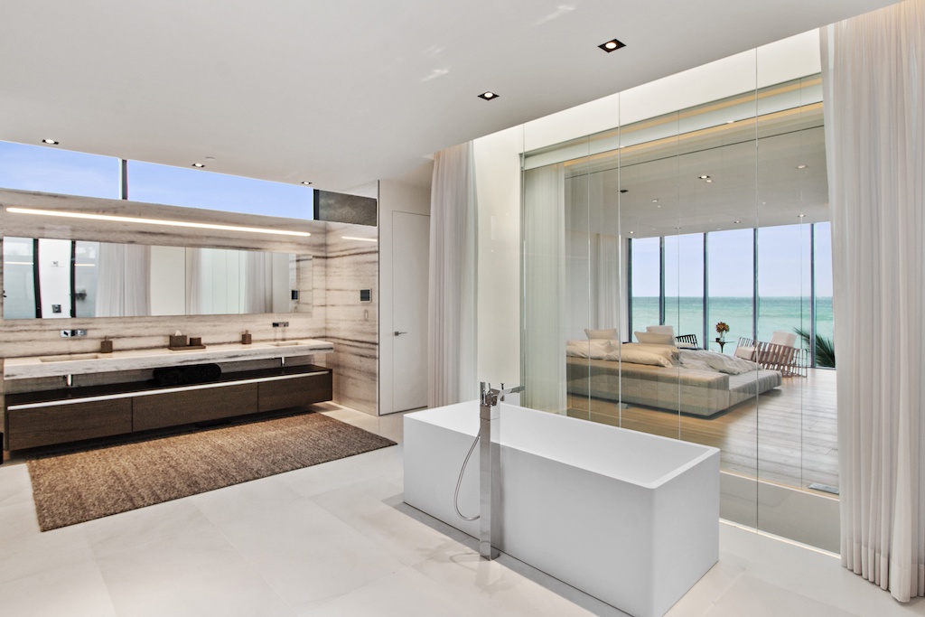 Upstairs on the 3rd floor, the luxurious 2400 square foot oceanfront master suite includes a separate area for relaxing, an indoor/outdoor private shower and hot tub, and a private office with a 180-degree view of the Atlantic Ocean and private balcony. The master bath is a study in modern elegance with white marble slab walls and separate vanity areas and water closets for him and for her. There’s an oversized slab marble shower with large rain head and huge master closet by Poliform. Two additional ensuite bedrooms, a large oceanfront gym, and laundry are also on this level. The roof features a huge 3000 square foot finished deck area.