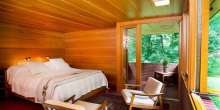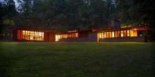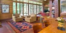 The unique structure, built from cypress wood, brick, and glass, features an L-shape plan common in Wright’s designs. The living and dining areas lie perpendicular to a string of bedrooms, while the kitchen sits cozily in the corner. The house also features the original built-in seating, tables, and chairs. Glass walls also give the house plenty of light and pleasant views of the surrounding woodlands.