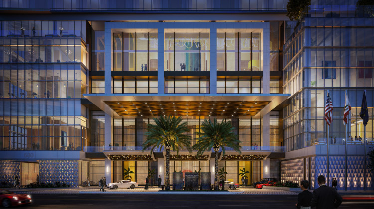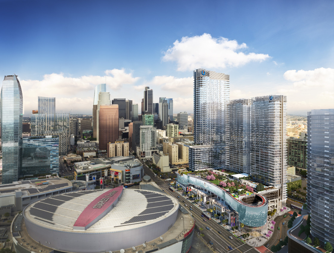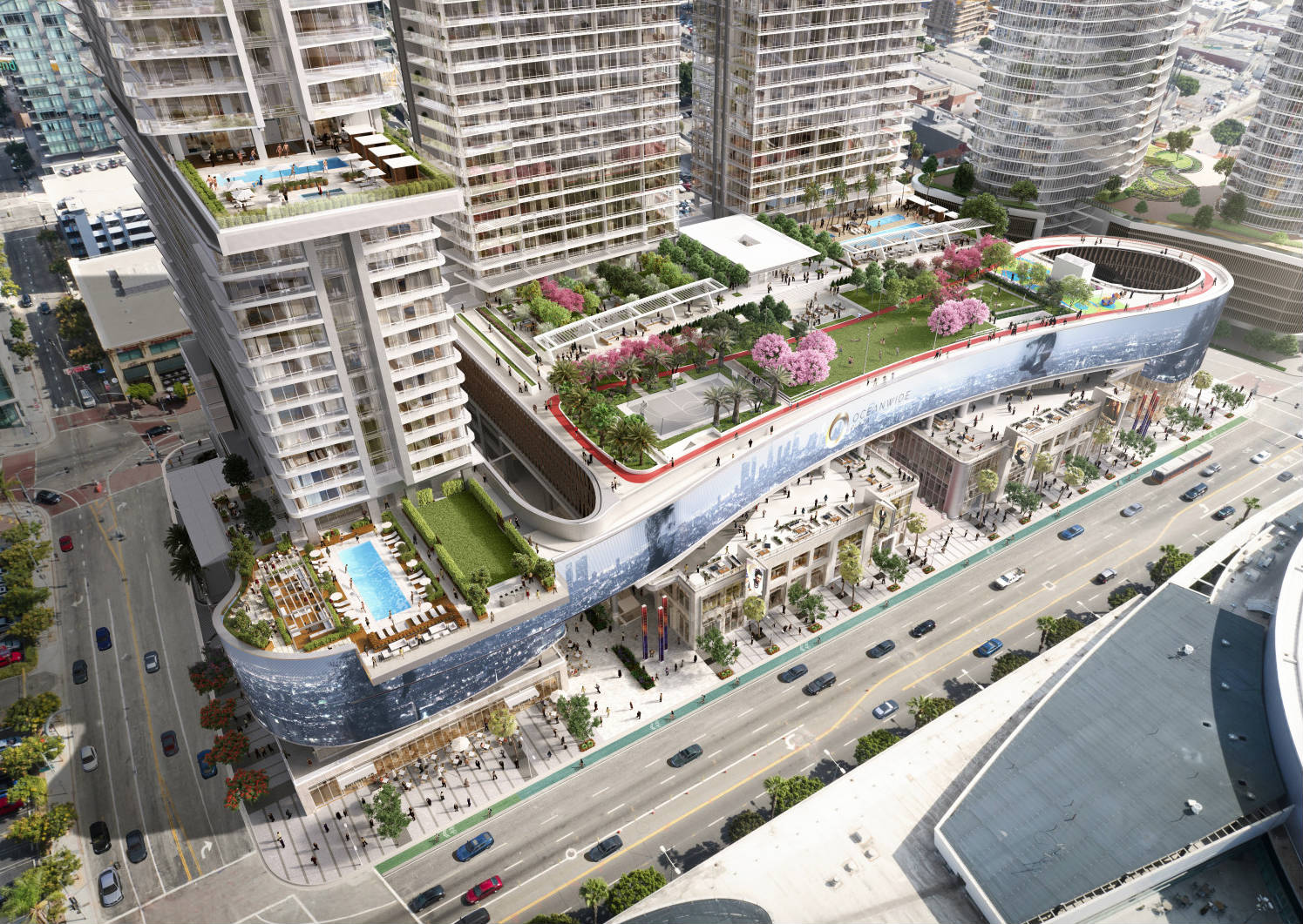 The complex, which will be located next to the Staples Center and L.A. Live, will also comprise a five-star Park Hyatt hotel, affixed to an approximately 166,000-square-foot open-air galleria, known as The Collection at Oceanwide Plaza, designed to host an assortment of shops and restaurants. A nearly 700-foot ribbon-shaped LED banner, prominently displayed along Figueroa Street, will wrap around the building.