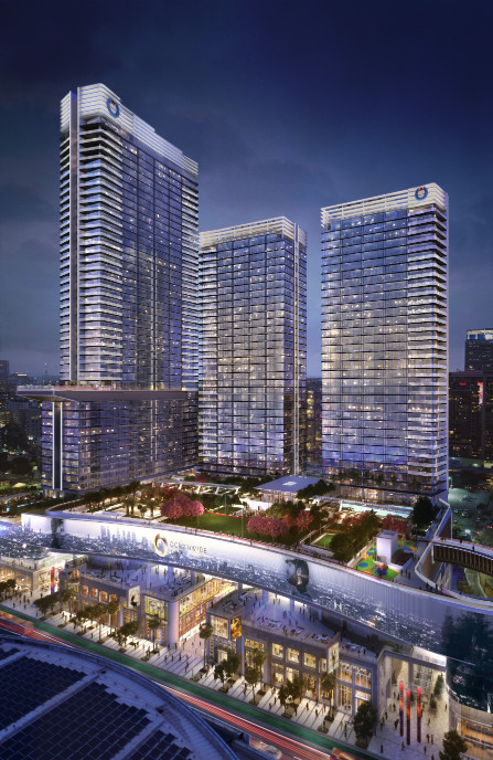 A total of 504 modern, luxury residences will make up the three residential towers, which will be positioned atop the seven-story podium. Most will be designed as two-bedroom layouts, each with a private balcony.