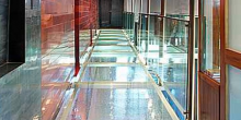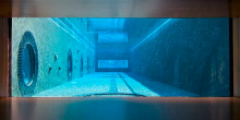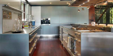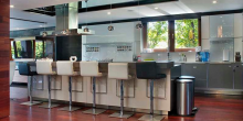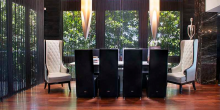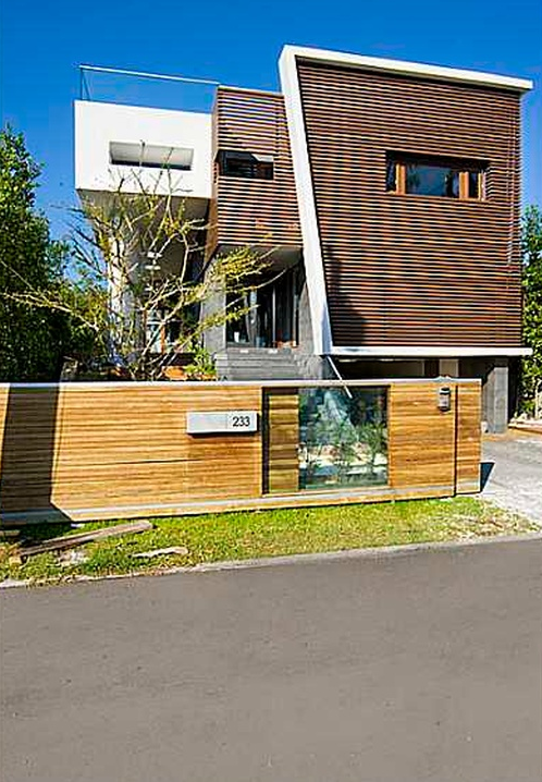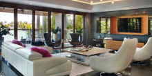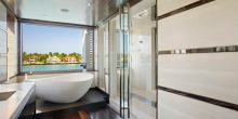 The 6,600-square-foot waterfront tropical modern home also features floor-to-ceiling windows, polished volcanic stone flooring, and a stairway made out of both glass and steel, as well as rich rosewood finishes, Caesarstone surfaces, and spectacular water views.