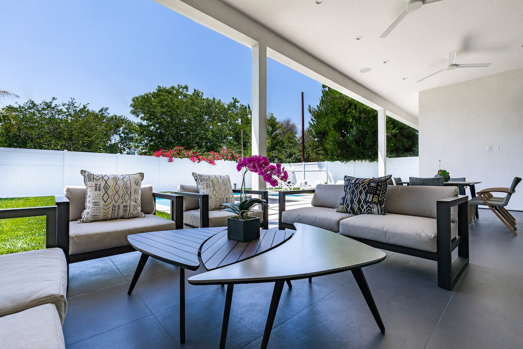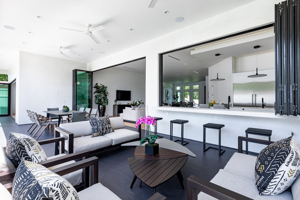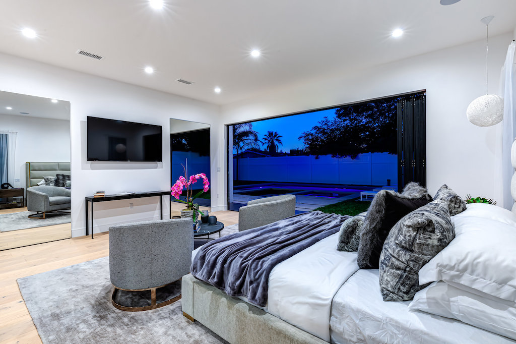 The airy open floor plan reflects a minimalistic yet traditional quality in its overall look, encompassing 4 spacious bedrooms and 4.5 bathrooms. Entertain in style in the voluminous grand room graced by 12 ft high ceilings, where the living room family room, dining room and gourmet kitchen create the heart of the home. The indoor space flows effortlessly through walls of glass doors into an alluring terrace living area and large backyard with a sparkling pool, spa and sunken fire pit poolside, for seamless indoor|outdoor entertaining.