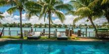 There’s a professionally equipped Ipe dock with remote-controlled boat and Jet Ski lifts, heated saltwater pool with outdoor shower and cabana bath, and an outdoor summer kitchen wrapped in Brazilian Ipe wood with gas grill for waterfront dining and entertaining.