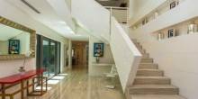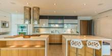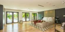 This sublime contemporary residence draped in Ipe wood and filled with natural materials also features sand-colored limestone slab floors throughout.