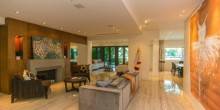 Guests can enjoy family time in the white custom eat-in kitchen with Gaggenau appliances and white quartz countertops, retreat to the huge master suite with luxurious dressing room and wet bar, and stroll through the property with a lush landscape design that is complete with meditation gardens.