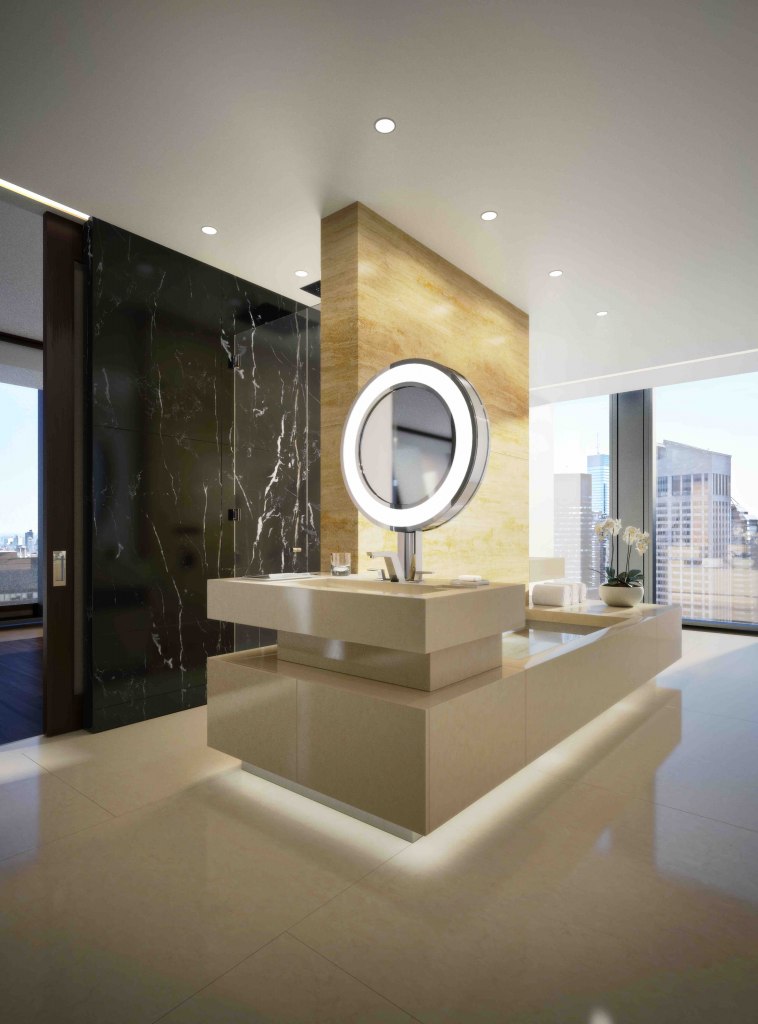 Here is another bathroom that incorporates unique marble. Unit34A in 53W53 is on the market for 9.675M and features a master bathroom clad in Noir St. Laurent marble, polished golden travertine and Verona limestone with a custom carved stone vanity and medicine cabinet. The master bath also features radiant heated floors and Dornbracht fittings and accessories.