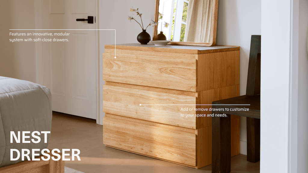 Made of 100% upcycled rubberwood, The Nest Dresser features an innovative modular system and soft-close drawers. Designed with flexibility in mind and Thuma’s signature Japanese joinery, you can add or remove drawers and completely customize your storage system.