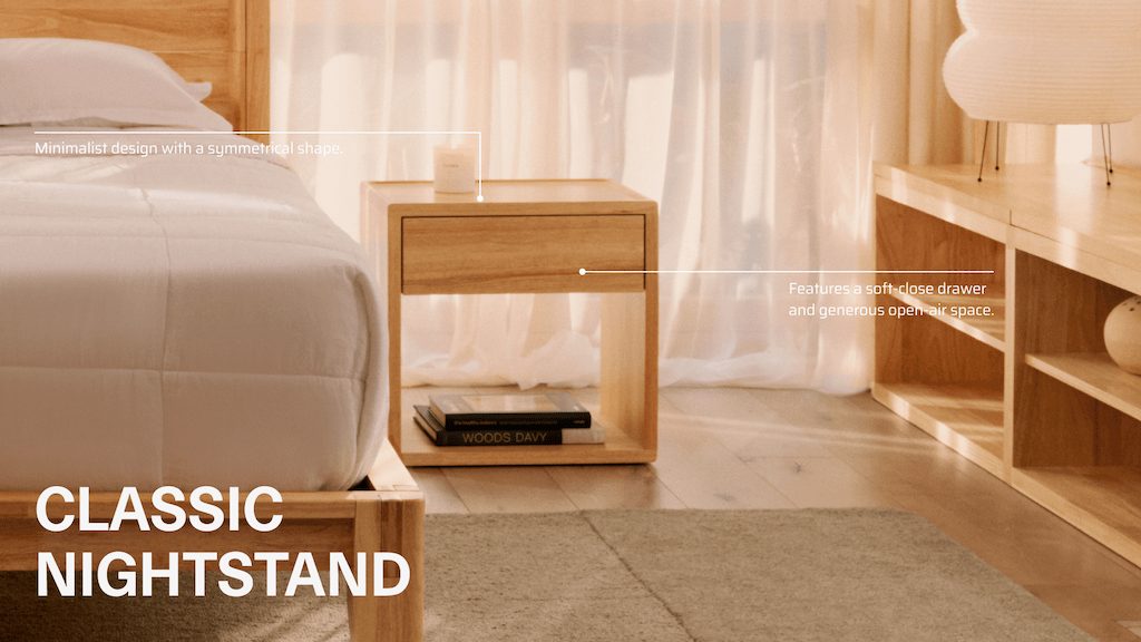 The perfect bedside companion, the Classic Nightstand has a solid wood drawer with generous storage space for intimates and valuables that are out of sight but within reach. The symmetrical shape and open-air storage are elegantly minimal. No assembly is needed; simply un-box and set it beside the Classic Bed.