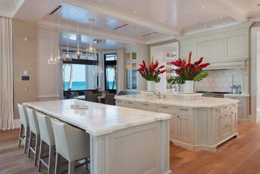 The Seminole Beach waterfront includes 11 bedrooms, 18 baths, two kitchens, a custom wine cellar, a theater room, a below-ground gym, a roof deck, an outdoor swimming pool, putting green as well as a basketball/pickleball court. A three-story, ceiling-to-floor Swarovski crystal chandelier towers near the stairway and “glimmers in imitation of the ocean,” according to the property listing with Sotheby’s International Realty.
