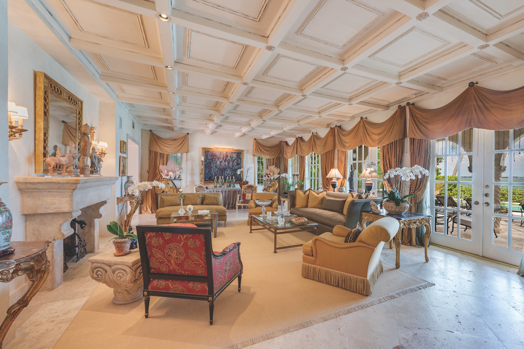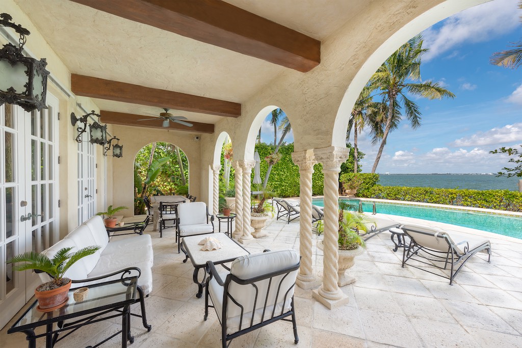 The bright and spacious living room features custom painted high coffered ceilings, wood-burning fireplace, exquisite Saturnia marble floors, faux finished walls and rows of French doors leading to an expansive covered loggia for al fresco dining & entertaining overlooking the pool with wide Biscayne Bay and downtown views
