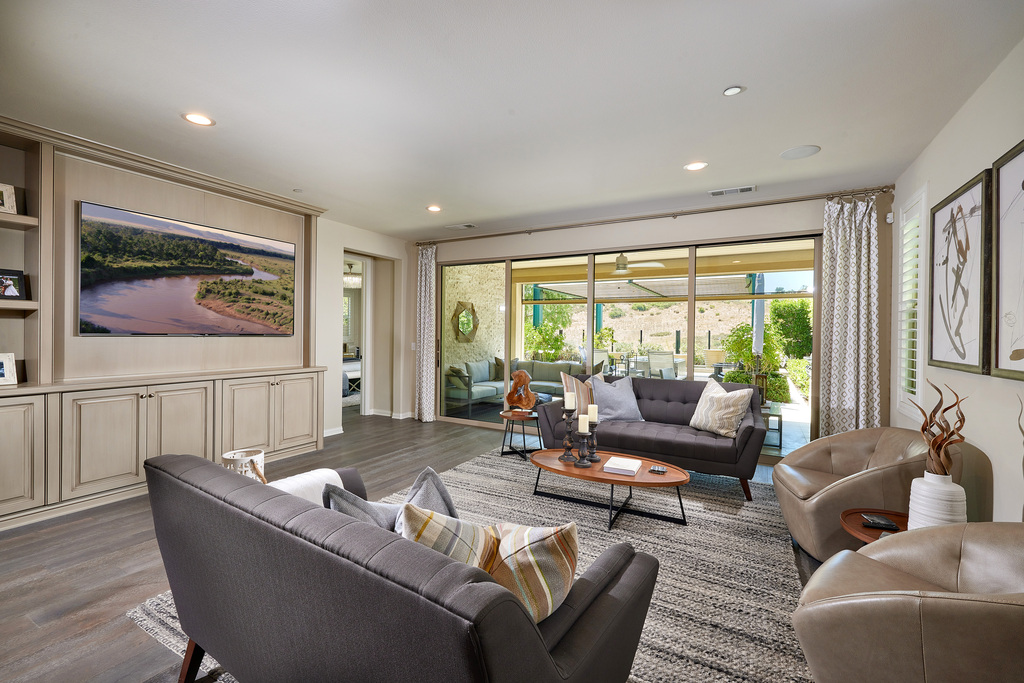 3B/2BA/2028sf There is only one Summer House Plan 1 model home. There is only one Auberge at Del Sur…the premier 55+ senior community in North County. And there is only one Summer House home currently for sale in Auberge. This stunning former model is single-level and beautifully appointed to demonstrate the builder’s premium options and detailed craftsmanship. The location is where one expects the builder’s model to be…conveniently close to the community assets of the clubhouse, pool, spa, fitness center, recreational facilities, BBQ, and with easy ingress and egress. (See the Document attachment for a detailed list of the Summer House Plan 1 “Upgrades-In-Model” provided by the builder, and then add plantation shutters, epoxy garage floor, and motorized screen for the outdoor Del Sur room well. The list goes on and on. A one-of-a-kind model home and just may be the one for you.