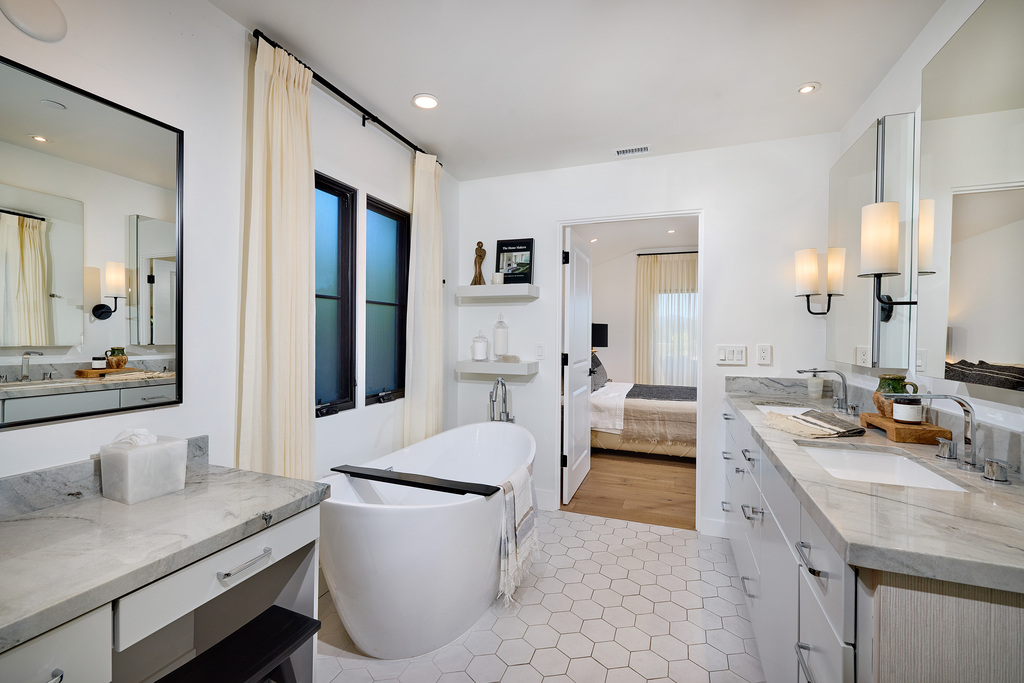 6159 Paseo Arbolado is a down to the studs 2023 complete remodel. Stunning in design, practical use of space, finely appointed and well positioned to capture peaceful panoramic mountain views. This beautiful home is part of Los Arbolados – a recently renovated elite condo enclave of detached single-family residences. 3028 square feet, 4 bedrooms, 4 ensuite baths, cook’s kitchen, butler’s pantry, generous great room, fireplace, 3 enclosed patios and zero yard maintenance. A lock-it-and leave-it jewel that will capture your heart, right in the heart of the Rancho Santa Fe Covenant Village.