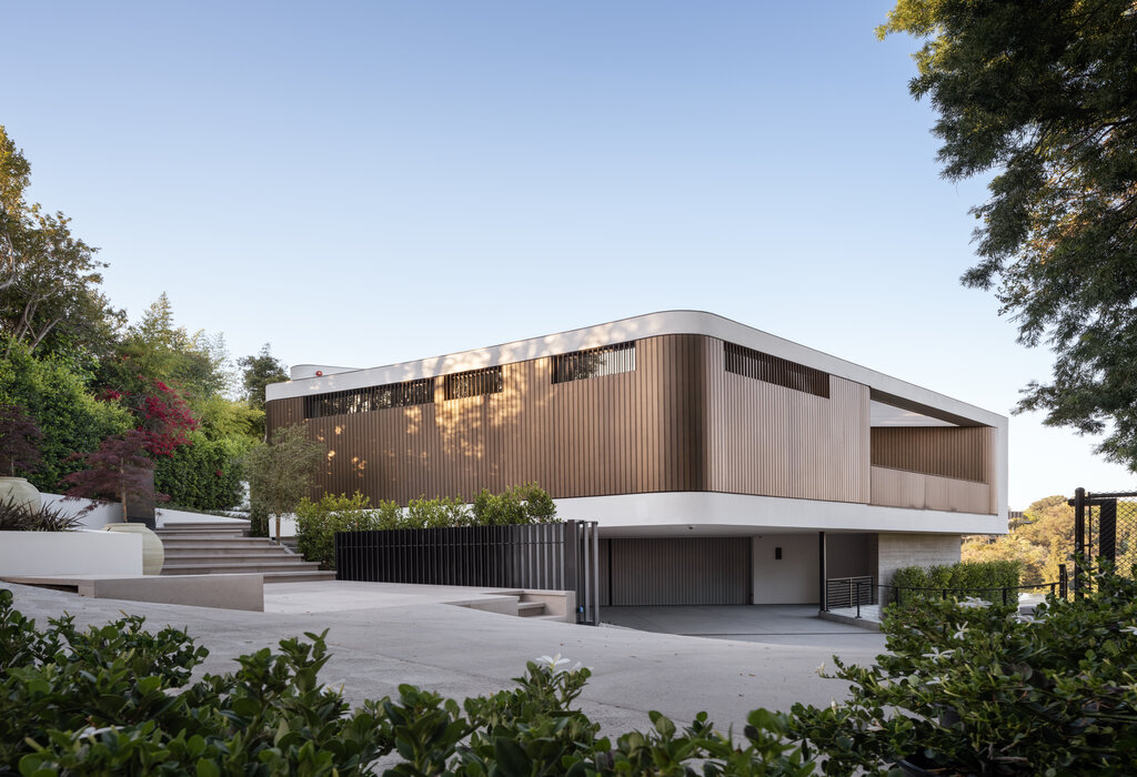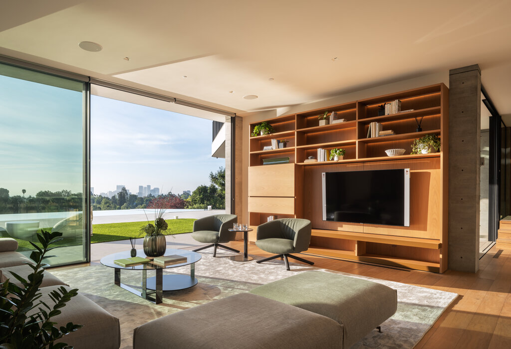 Both bold and dynamic, formal and intimate, exclusively sited with sky-sweeping views, the genius of synchronous design by world-renowned Zoltan Pali is defined in this architectural residence overlooking the manicured fourth green of Bel Air Country Club and adjacent to a serene Japanese Garden. The home’s horizontal yet fluid rhythm begins as the cobblestone courtyard unveils the skyline view, carries through the privately gated and modest entryway, and flows into an unassuming reveal of the 17,401 square-foot masterfully crafted eight-bed, eleven-bath residence with all three levels anchored by a striking staircase. The modernist architectural exterior was crafted with Indiana limestone and curved bronze metalwork to complement the tranquil refined palette, thoughtfully angled with a blended wall-cladding of travertine and board-form concrete and French walnut floors. Generous use of glass, sliding doors on each bedroom, and two levels of day-lit space with oversized spacious decks and an infinity pool together create an extension of outdoor living to the floor space. The west wing of the top level offers an open kitchen with a breakfast area complete with a blend of Miele, Wolf, and Sub-Zero appliances, Ceppo di Gré stone, a dining room, an expansive living room separated by a travertine fireplace, and guest quarters. The southeast corner is devoted to the primary suite and the emerging olive treetop of the two-story courtyard. The lower level, an amenity showpiece, includes a mini primary suite, a gym, a wellness center, a family room, and additional en-suite bedrooms, all opening to the floating deck with a pool and spa. The lowest level completes the home with staff quarters, a theater, and a wine room. A masterwork home by Viewpoint Collection positioned on one of East Gate Bel Air’s finest streets.