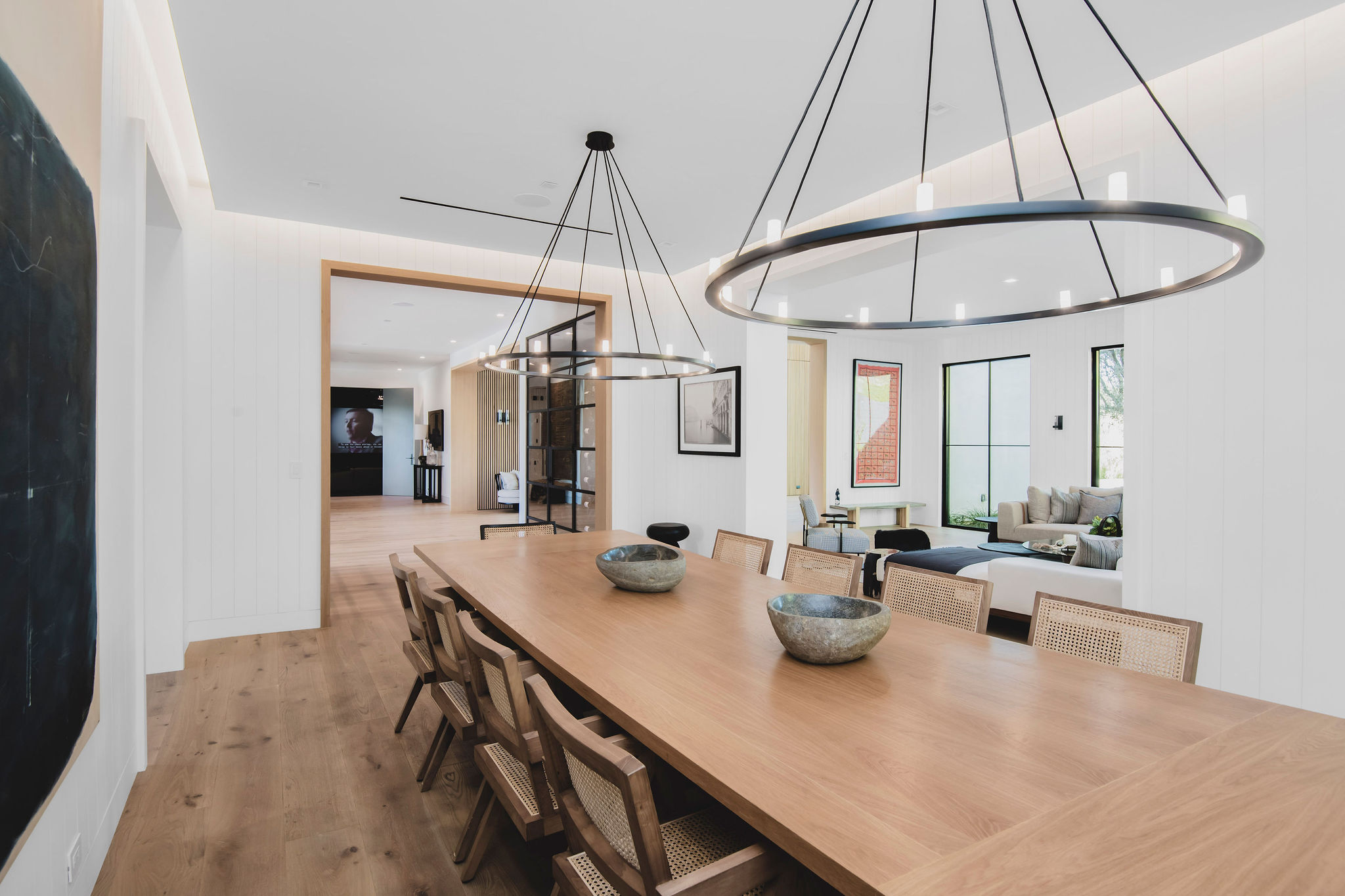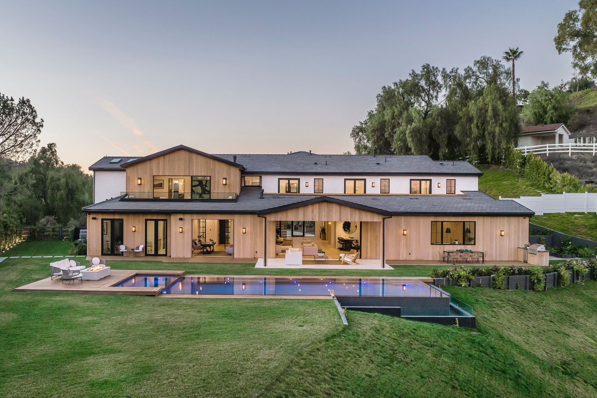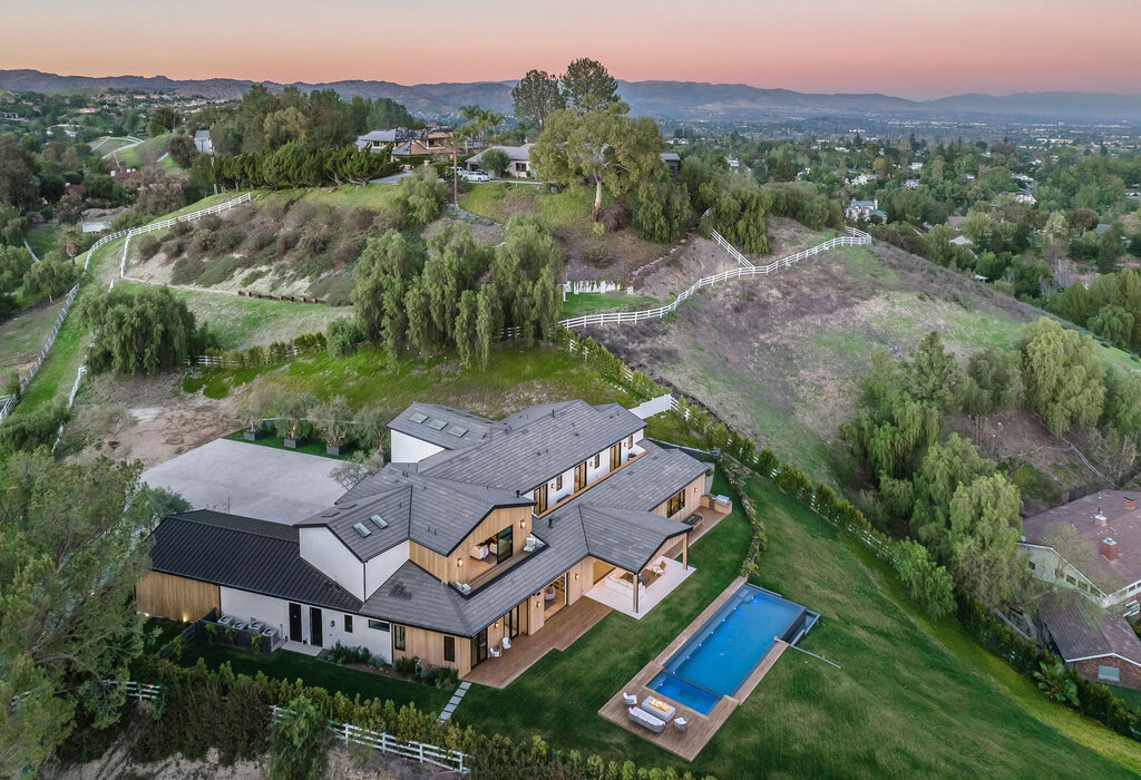 This immaculate new contemporary farmhouse on 2.4 acres sits at the end of a private drive behind the guarded gates of the City of Hidden Hills and has been meticulously crafted for utmost tranquility and seclusion. The grand, double-height entrance showcases the epitome of architectural precision with skylight lit walls of fine white-oak planking, floating stairs to the open upper-level landing, and an unobstructed direct view to the picturesque backdrop. Formal living and dining rooms feature paneled painted wood, oversized iron detail picture windows, floating lit ceilings, accented wood doorways, and are anchored by a fireplace with book-matched slabs of custom stone. The artisan chef’s kitchen is stretched with bespoke cabinetry and elegant stone island and countertop creating a uniquely seamless visual masterpiece all looking out to the rolling rear grounds. The primary suite exceeds all expectations with dual walk-in custom closets, vaulted ceilings, an elegant fireplace, breakfast bar, a resort-style bath w/soaking tub, steam shower, and a balcony sitting atop the private hillside out to the captivating horizon views. Completing the luxe abode is 4 additional bedrooms, a spacious state-of-the-art theatre room, functional gym option with full bath, widened hallway lined in dual marble wine walls, built-in custom shelving and bar, an infinity-edge pool w/spa, outdoor fire pit, and built-in BBQ, and a 900ft 4-car garage with extended motor court private driveway. One of the finest new opportunities in the community of Hidden Hills.