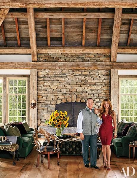 In a rustic, spacious entertainment space known as “The Lodge”—which features ceiling and flooring made of reclaimed wood—the couple poses next to a pair of Linda Horn antler-framed chairs, and an ottoman upholstered in Ralph Lauren Home cotton velvet.