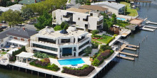 On a corner lot of two adjoining waterways on Jamaica Bay, the estate overlooks Mill Basin and has quick access to the Belt Parkway and Kings Plaza Shopping Center. The property is designed as two houses in duplex fashion totaling 23,000 square feet – the main house of 15,000 square feet and the adjoining home at 8,000 square feet, with a total of four kitchens, five staff rooms, seven master suites, elevators to all levels, media rooms and gatehouse. Waterside is a 1,000 square foot pool and spa and 257 feet of water and dock frontage for multiple watercraft. Unique touches are found in the Lalique fireplace surround and the circular meditation room. Indoor parking will house up to seven cars and the secure, gated estate is surrounded by lush gardens and peaceful water views.