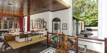 Since 2006, this tropical enclave is where Kid Rock and his son, Robert, Jr., have come to kick back – well, maybe with one of his Bad Ass Beers, walk down to the beach and get inspiration for writing music and decompress from exhausting musical tours. Located in Malibu’s residential community of Point Dume, this 8,305 square foot, open and airy serene residence is made up of dark hand-carved wooden columns, beams and doors that bring an earthiness to the sleek architecture and pristine white walled background. Large sweeps of glass open to the lanai, balconies and tropical landscape with views of the pool and guest house situated across the lawn. Inside, there are five bedrooms, five full baths, a family-media room and gym. The large chef’s kitchen and dining room are perfect for entertaining and the formal living room can be turned into a screening room for multiple guests. In keeping with the exclusivity of Point Dume, the beach maintains its privacy through keyed access.