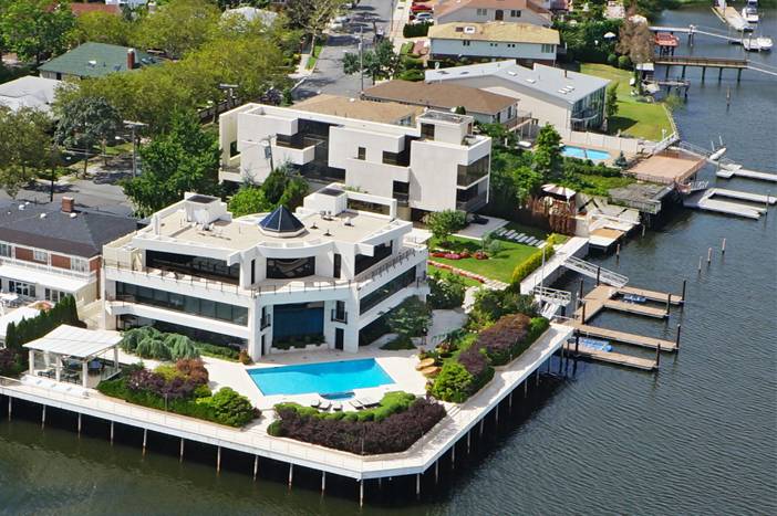 On a corner lot of two adjoining waterways on Jamaica Bay, the estate overlooks Mill Basin and has quick access to the Belt Parkway and Kings Plaza Shopping Center. The property is designed as two houses in duplex fashion totaling 23,000 square feet – the main house of 15,000 square feet and the adjoining home at 8,000 square feet, with a total of four kitchens, five staff rooms, seven master suites, elevators to all levels, media rooms and gatehouse. Waterside is a 1,000 square foot pool and spa and 257 feet of water and dock frontage for multiple watercraft. Unique touches are found in the Lalique fireplace surround and the circular meditation room. Indoor parking will house up to seven cars and the secure, gated estate is surrounded by lush gardens and peaceful water views.