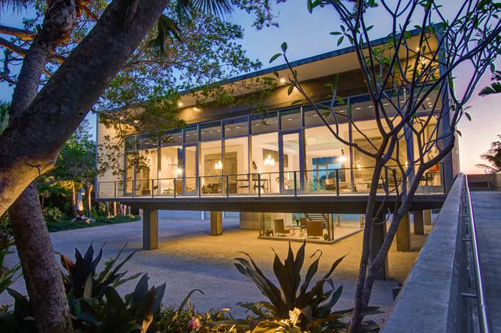 Educated at Harvard and chosen by “Architectural Digest” to be included in its “2014 AD100 Architects,” Toshiko Mori designed this dramatic contemporary home using an unusual technique with glass, building it on stilts to optimize the Gulf to Bay views. Built on 2.5 acres of beachfront and Intracoastal Waterway, “West Wind” is comprised of 7,121 square feet with six bedrooms, nine bathrooms, den and bonus room on the interior with swimming pool and a two bedroom guest house that was once a Coast Guard barracks. All this is surrounded by lush tropical landscaping, including over 60 varieties of palms, fruit trees and other vegetation. The entrance from the ground is centered under the house’s center atrium with a partial glass floor that ushers in light from the glass atrium roof. Architect James Carpenter designed a dichroic glass prism which diffuses daylight from clerestory windows into a spectrum of colors that change with the viewing angle.