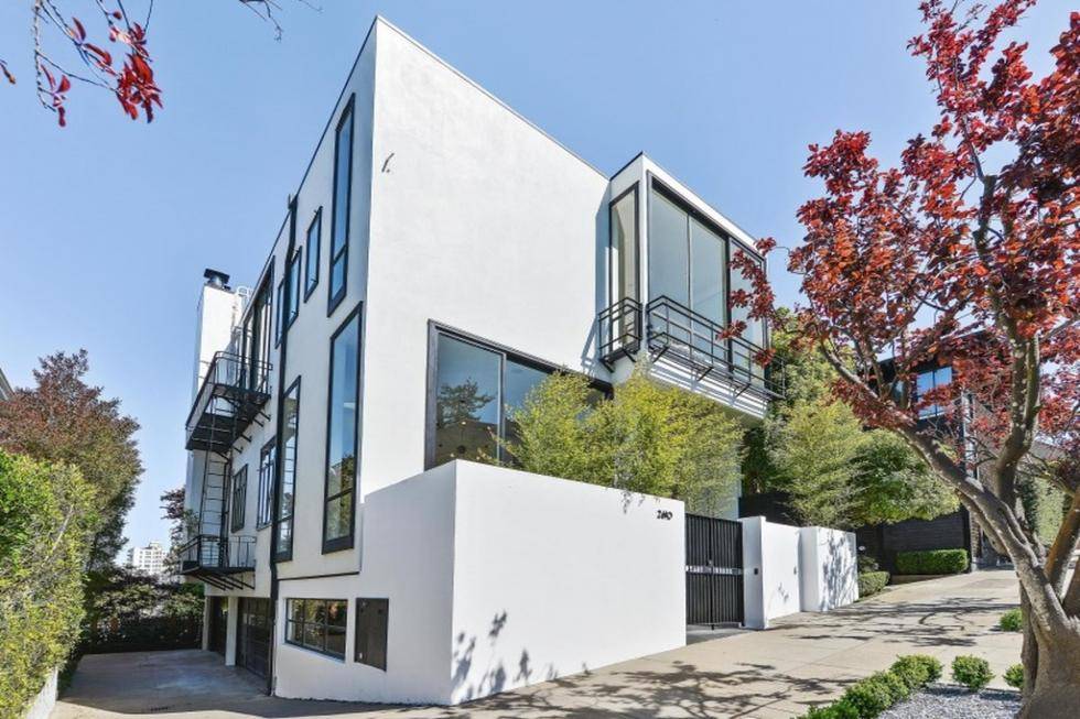 Two large, glass-encased living spaces—each with a wet bar and fireplace, overlooking San Francisco Bay and Alcatraz—rest on separate levels, accessible via an elevator that leads to all three floors. The property also comes with enough parking space to accommodate up to five cars.
