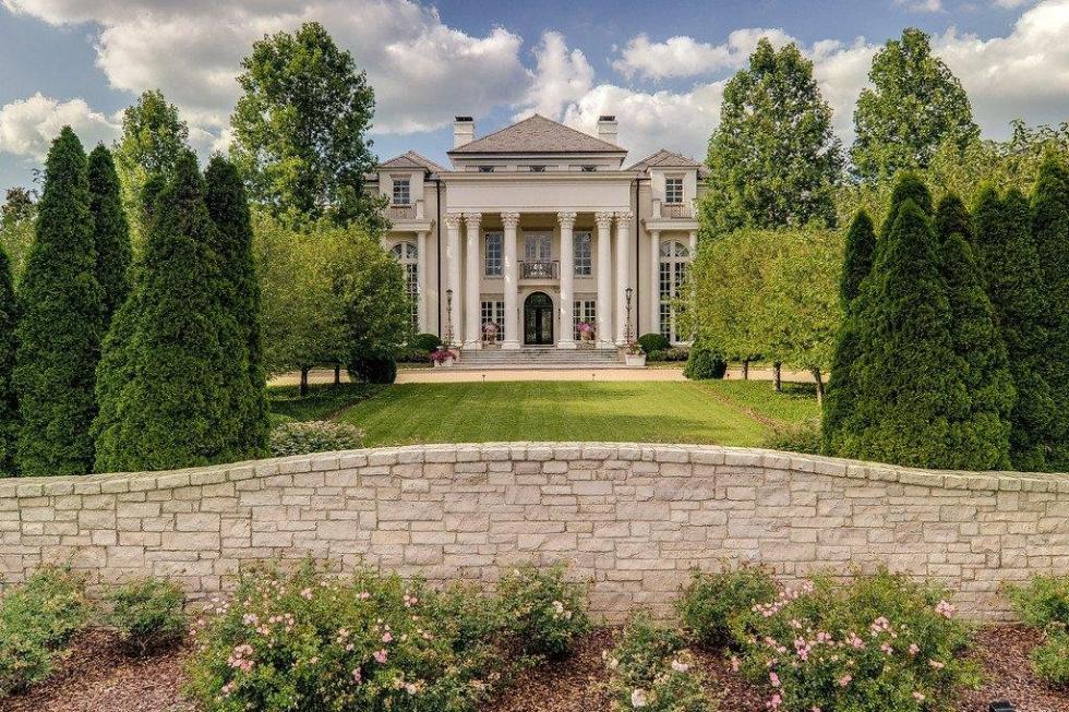 Commissioned in 2001 by FirstBank Middle Tennessee on over 22 acres, the 19,000-square-foot mansion touts four bedrooms, nine baths, vaulted 24-foot ceilings, stone columns, and a wall-paneled library. The residence’s wooden floors are inlaid with marble, floor-to-ceiling windows, a hidden elevator, and a hand-carved Macodenian marble fireplace. Managed with a Creston system, the grand dwelling also houses a screening room and a temperature-controlled wine cellar equipped with a built-in humidor, and boasts walls paneled with onyx.