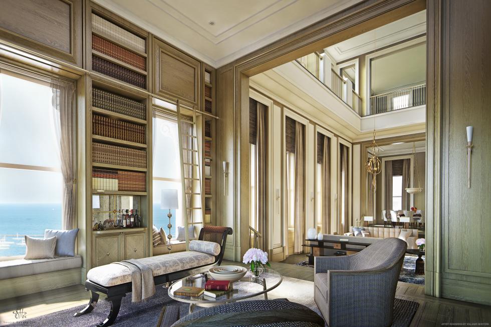 The enviable property—located high above the heart of cultural downtown Chicago—also offers its new owner the chance to employee his own architect or interior designer, or utilize the plans already drawn up by George Larson of Larson Associates, which covers the entire 26th floor and includes the grand foyer, living and entertaining space, private entrance lobby, gallery with library, coat and powder rooms, a generous living room punctuated by a glass staircase, and a dining room, kitchen, garden room, and four bathrooms. Buyers may purchase the 26th floor alone for $2.3 million, or the entire two-story residence for $3.3 million.