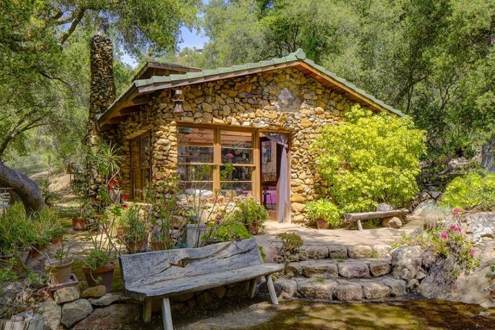Perfect for nature-lovers and fairytale fans alike, the stone-and-timber property is surrounded by lush foliage and enjoys ample shade. Previously a plant nursery, the business was transformed into a residence in 1963 with vivid outcroppings of cactus, palm forests, fruit trees, and a babbling brook. Three quaint structures totaling three bedrooms and baths offer 2,190 square feet of living space, and sit beneath a canopy of leaves and winding branches. The first touts an open living area complete with a fireplace, a kitchen with a skylight, an art studio, and a full bath, while the second has a master suite with a kitchenette, another fireplace, stained glass doors and windows, and a walk-in closet and bath equipped with a Japanese soaking tub. The last unit holds a guest room with a 15-foot ceiling and enjoys Pacific Ocean views.