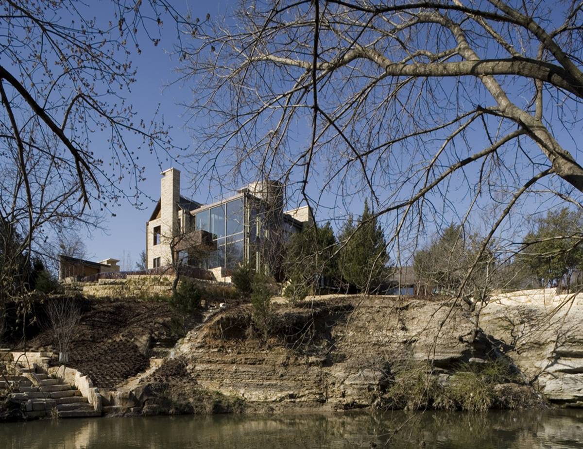 Designed to entertain groups both large and small, the haven—embellished with finishes of gold granite, black onyx, Douglas fir, and Lueders stone—has a four-story winding stairway that starts at its wine cellar, provides views from all floors, and ends at the rooftop terrace.