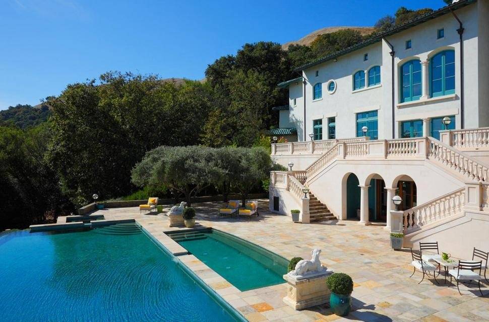 Equipped with smart house technology, the Wine Country estate also features antique European stone terraces that are enveloped by sculpture gardens and pools, while its 65-foot infinity pool sits in the midst of lush lawns and landscaping.