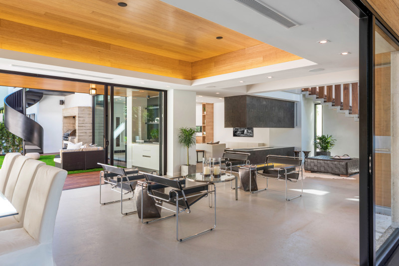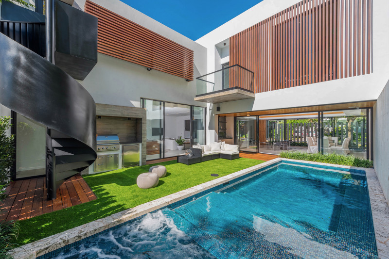 The meticulously designed tropical modern oasis features an ultra-chic facade with limestone and wood floors to match bamboo ceilings, Mia Cucina kitchen, vanities and closets, a state-of-the-art smart home, a heated pool and spa, two-car air-conditioned and insulated garage, and a plethora of natural sunlight throughout the home to provide the finest in South Florida living.