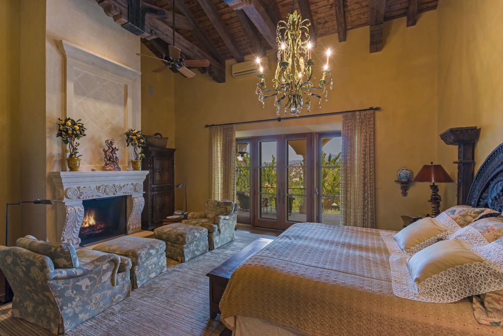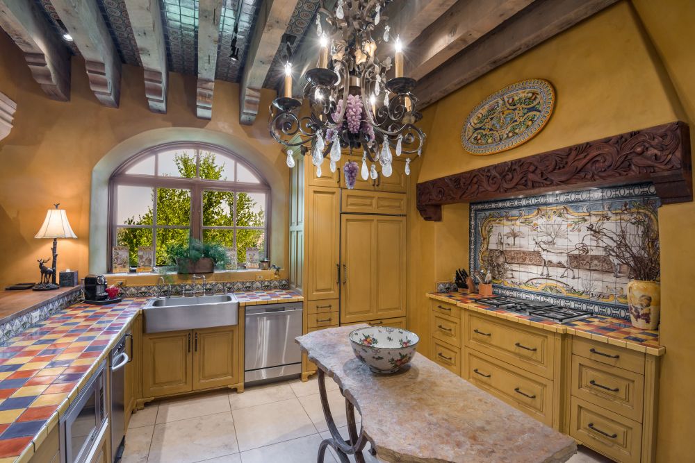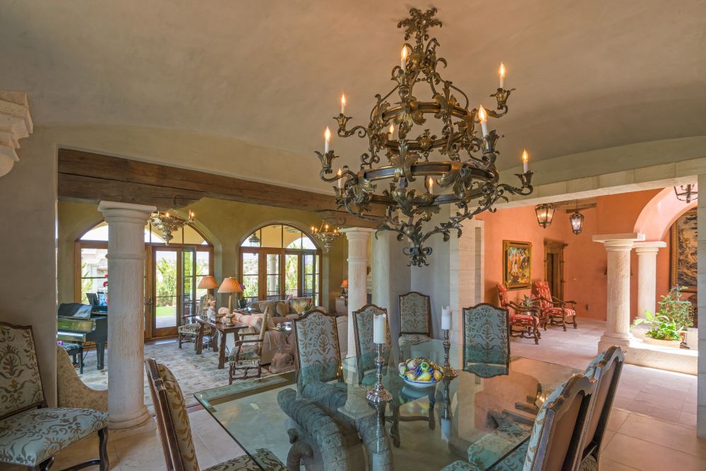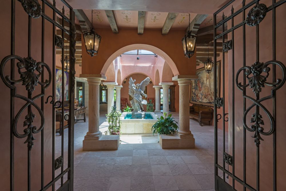 Offering a regal introduction are a stone-lined drive and an impressive motor court with a masterful blend of Spanish tiles, natural stone, and antique wood and wrought iron.