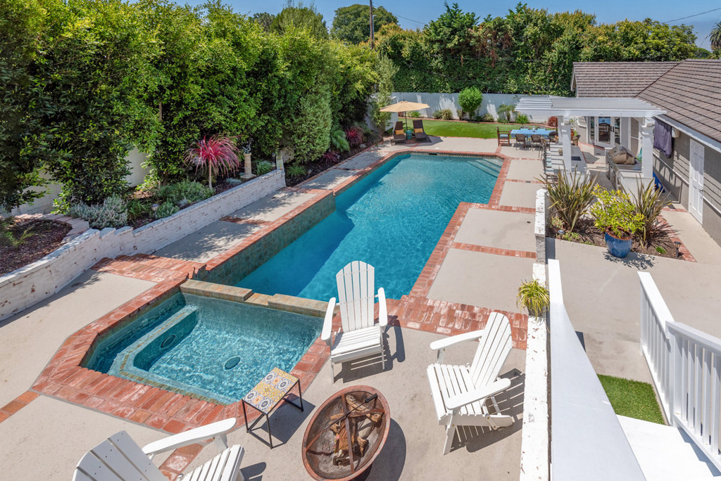The main house contains four bedrooms and six baths at just over 3700 sq. ft. Three of the bedrooms are en-suite with private balconies and newly remodeled baths in Carrera marble, Calacatta Neolith, or Quartz, respectively. Throughout the home, one will find updated lighting and oodles of natural light. Built for the Southern California lifestyle, the home is constructed with an open floor plan including a large family room adjacent to the kitchen and flex-space upstairs, perfect for a game room or movie room. The open modern galley kitchen includes ample storage space, a large kitchen island, updated pendant light fixtures, and a separate food prep area topped with Carrera marble.