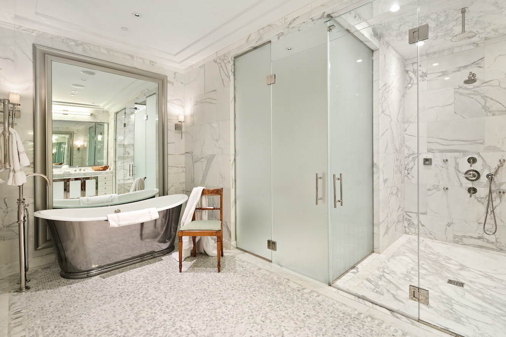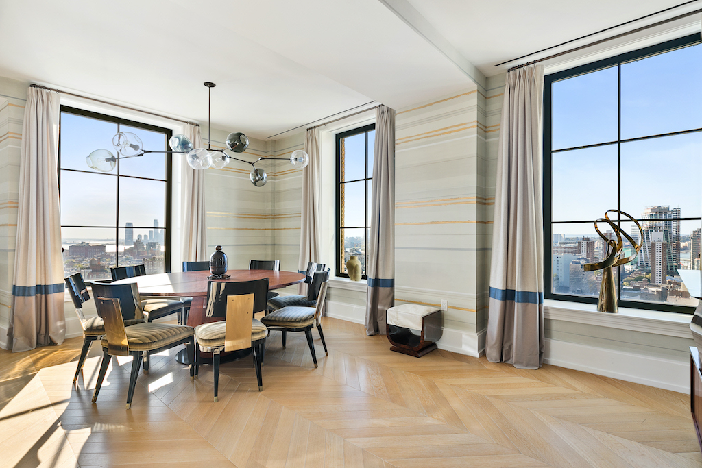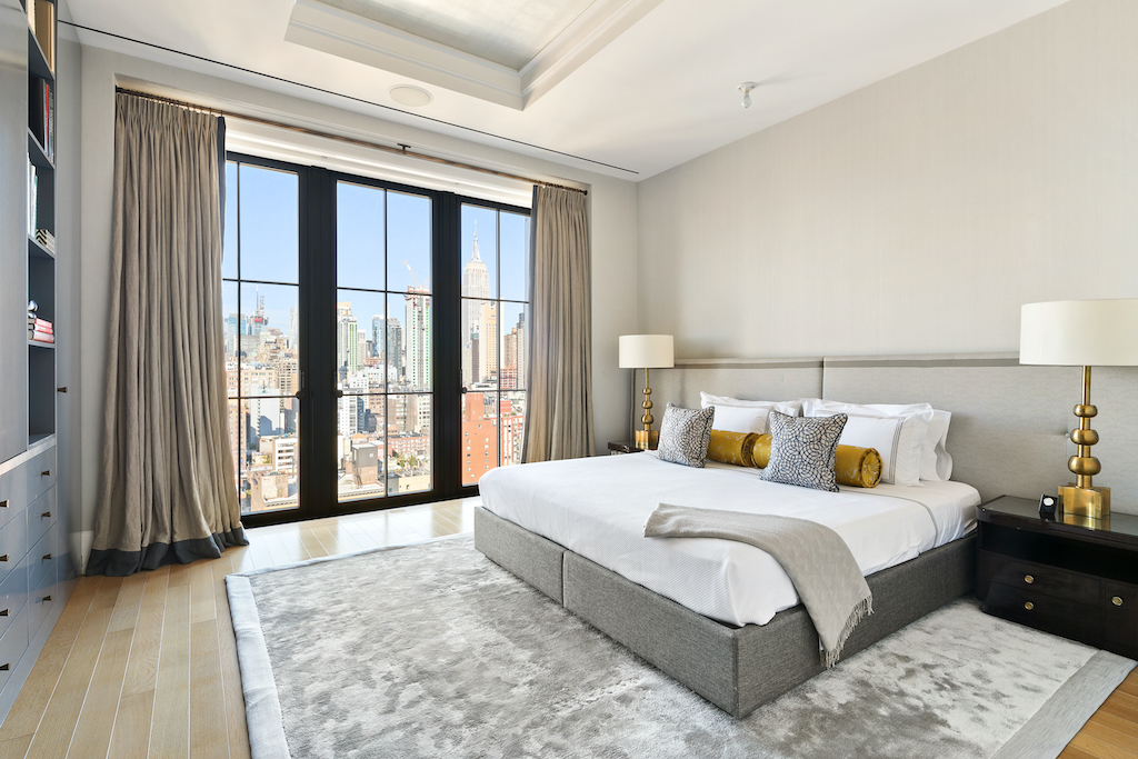 The first master suite has a unique dual north and south exposure, along with a windowed en-suite bath and walk-in closet. The second master suite features dramatic floor to ceiling windows framing the Empire State Building and midtown views. It also has a custom-fitted walk-in closet and oversized five-piece ensuite bath. Additional bedrooms come complete with ensuite baths and ample closet space. A central gallery and home office with a custom desk and bookcase complete this spectacular offering. Top of the line details throughout the apartment include radiant floor heating, hand laid French herringbone oak flooring, Crestron Home Automation System, Nanz hardware, a built-in humidification system, an ultra-quiet central air conditioning system, a dedicated ventilation system and high-end Toto toilets. Amenities include a 24-hour doorman, concierge, lounge, refrigerated storage, playroom, bike storage, gym, sauna and a beautifully appointed roof deck.