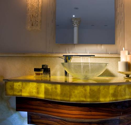 As you enter my master bathroom you are welcomed by a splash of rich and deep green-colored marble wall that spans the entire width of the back of the bathroom. It is a focal point creating a backdrop for an open-type shower and a freestanding thermo oval soaking tub. That entire area is raised creating a step-up and framing the most important parts of my bathroom. This marble backdrop unites two wet areas and it is designed to withstand water spills from the tub, or shower. All that [is in place] because there is definitely some splashing happening here—the shower has an oversized rain head and multiple body jets simulating an under-a-waterfall invigorating bathing experience. But on those days when I just need to relax and read a book, I would opt for a warm aromatic bubble bath instead. The tub is crowned with a ceiling-mounted bath filler centered over it. The tub filler is especially interesting as it creates a single stream of water without splashing as it terminates in the tub. I created a niche in the back wall that spans the entire width of the green-marbled wall, but on the tub side it includes a triple bio-fuel fireplace, and extending into the shower it serves as a storage niche.