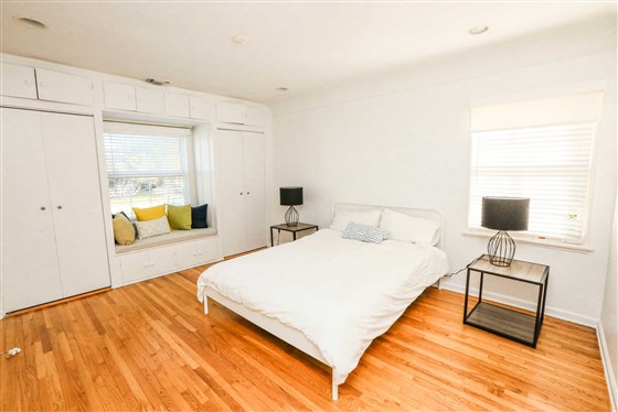 This iconic moment from Pulp Fiction might sneak into your mind as you drink your morning Joe on the breakfast bar. Yet, there are many spaces that got little on-camera time. The spacious, light-filled living-and-dining area is among them. So is the minimalist master bedroom, which comes with a window seat and plenty of custom wall storage.