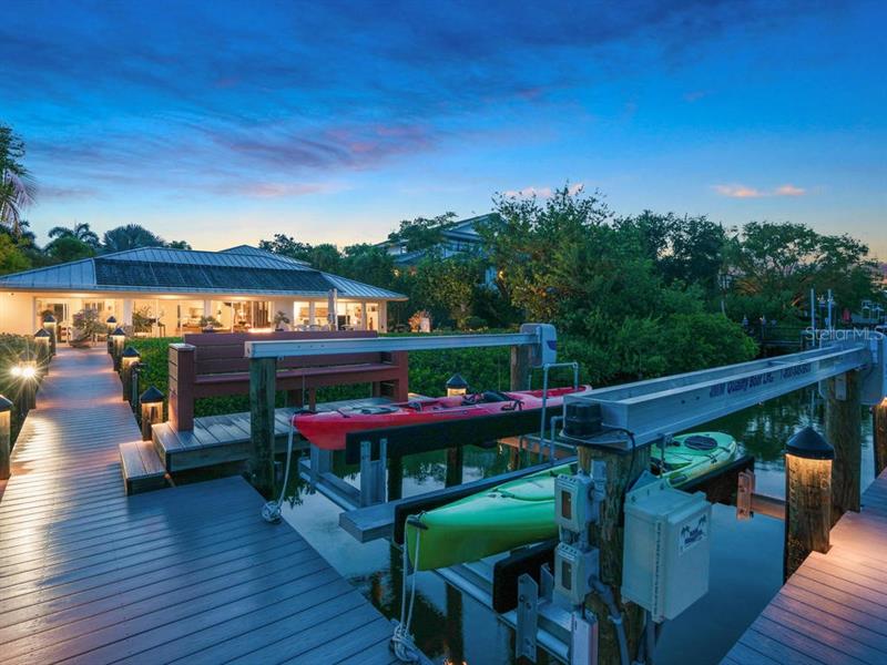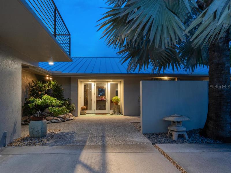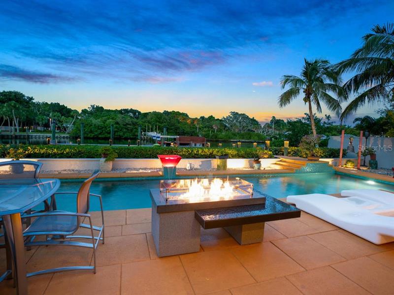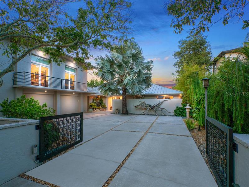 Mid-century modern design, sunshine, and gentle breezes come together in this stunning gated waterfront residence on the north end of Siesta Key. The location is great for the boater or water sports enthusiast with direct access to the bay and Gulf beyond. Designed by well-known Seibert Architects, this home embodies the modernist style in the use of expansive walls of glass, open floorplan, natural materials, clean lines, and functional design. Once inside, one is struck by the sense of space and the wall of glass giving way to the expansive pool area and tranquil water just beyond. Maple hardwood floors, custom cabinetry, exotic granite countertops, and exquisite tile work are just some of the elements running throughout this home. The living room offers vaulted ceilings and room for multiple seating areas. The adjacent dining room is open to the galley kitchen featuring beautiful custom cabinetry, stainless-steel backsplash, high-end appliances including a gas cooktop, walk-in pantry, casual breakfast area, and sliding door access to the front patio. The master suite is a true spa-like retreat and has access to the patio and pool area through a wall of sliding glass doors. There is a guest bedroom, an additional bathroom, and a large laundry room in the main house. Guests will not want to leave their private two-bedroom suite above the garage featuring Saltillo tile floors, vaulted ceilings, built-in cabinetry, and kitchenette. Multiple outdoor seating areas and a 50 foot heated pool, spa and dock with boat lift complete this incredible waterfront retreat.